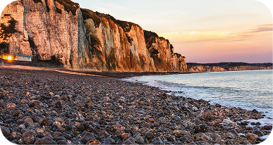 Grande plage de galets, idéale pour se balader, pique-niquer ou profiter du coucher de soleil.
